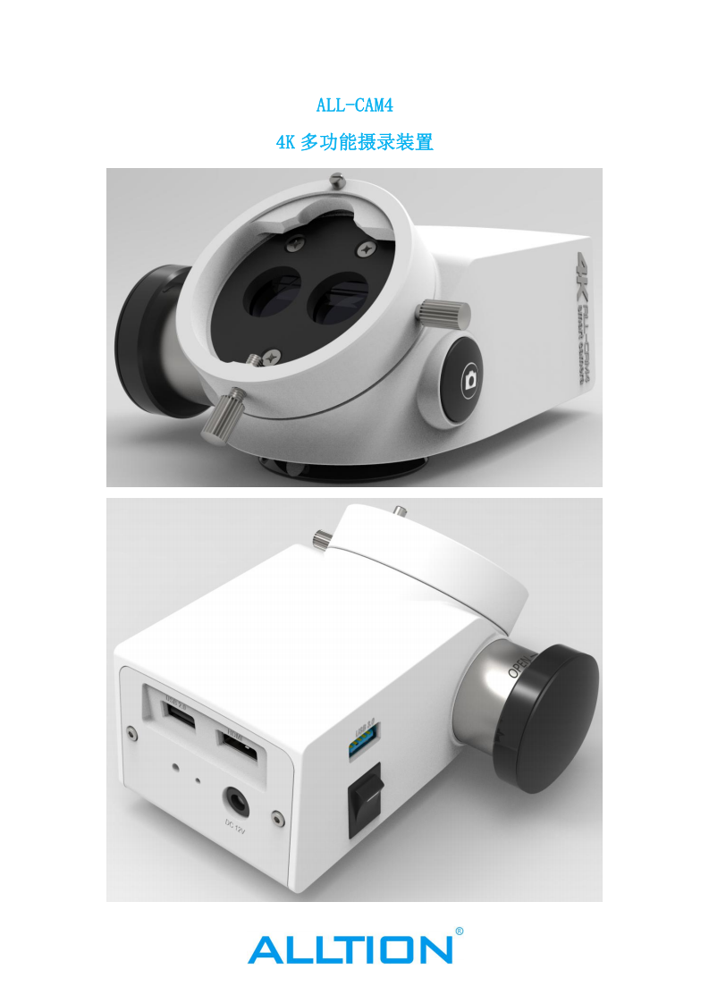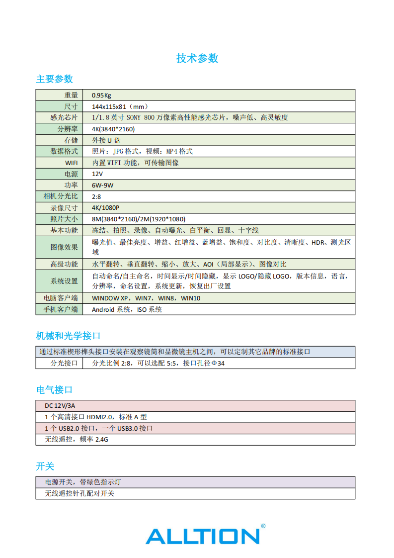 品牌ALLTION型号ALL-CAM4是否可定制否颜色白分辨率4K(3840*2160)感光芯片1/1.8英寸SONY800万像素高性能感光芯片主要功能冻结、拍照、录像、自动曝光、白平衡、回显、十字线
